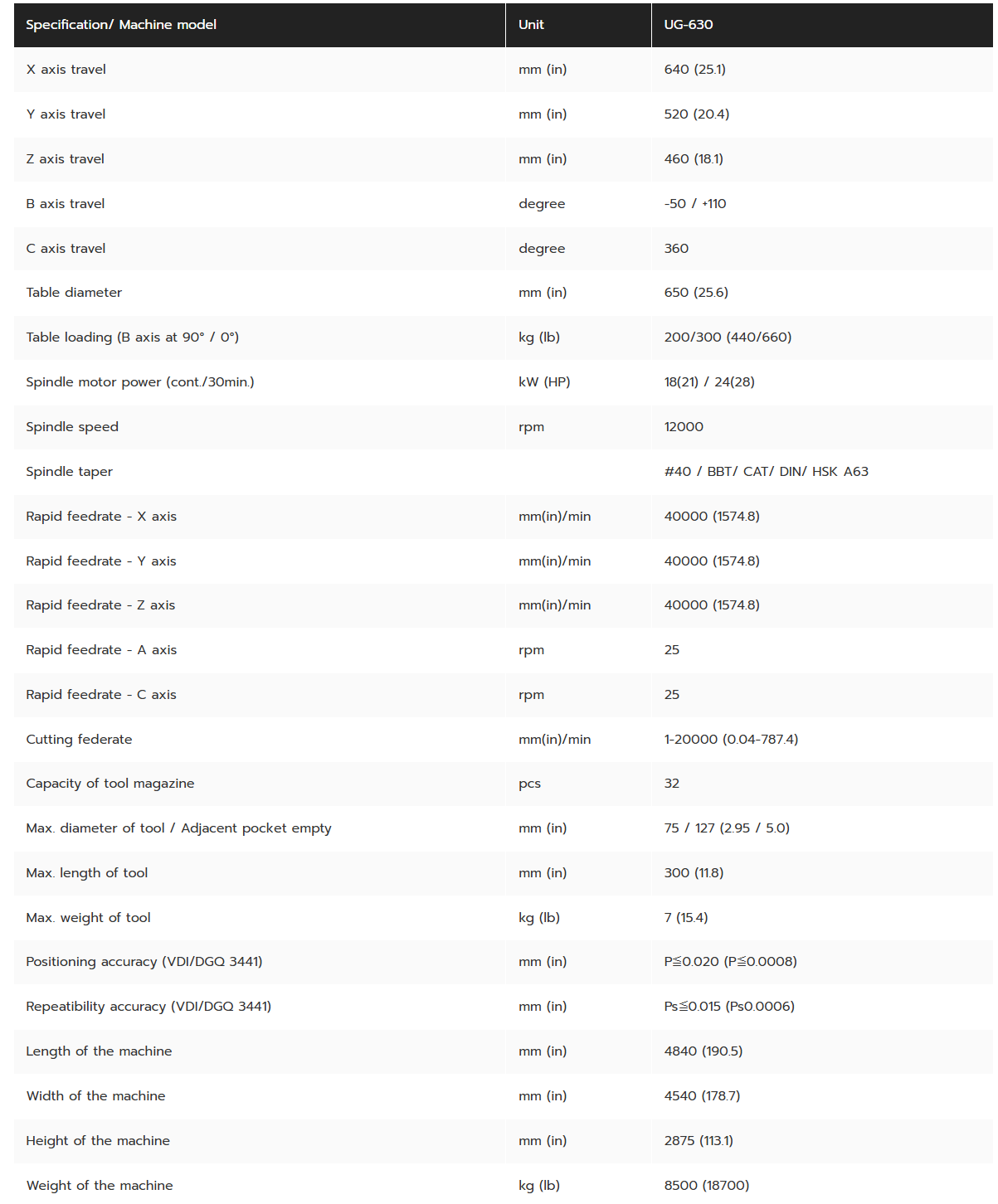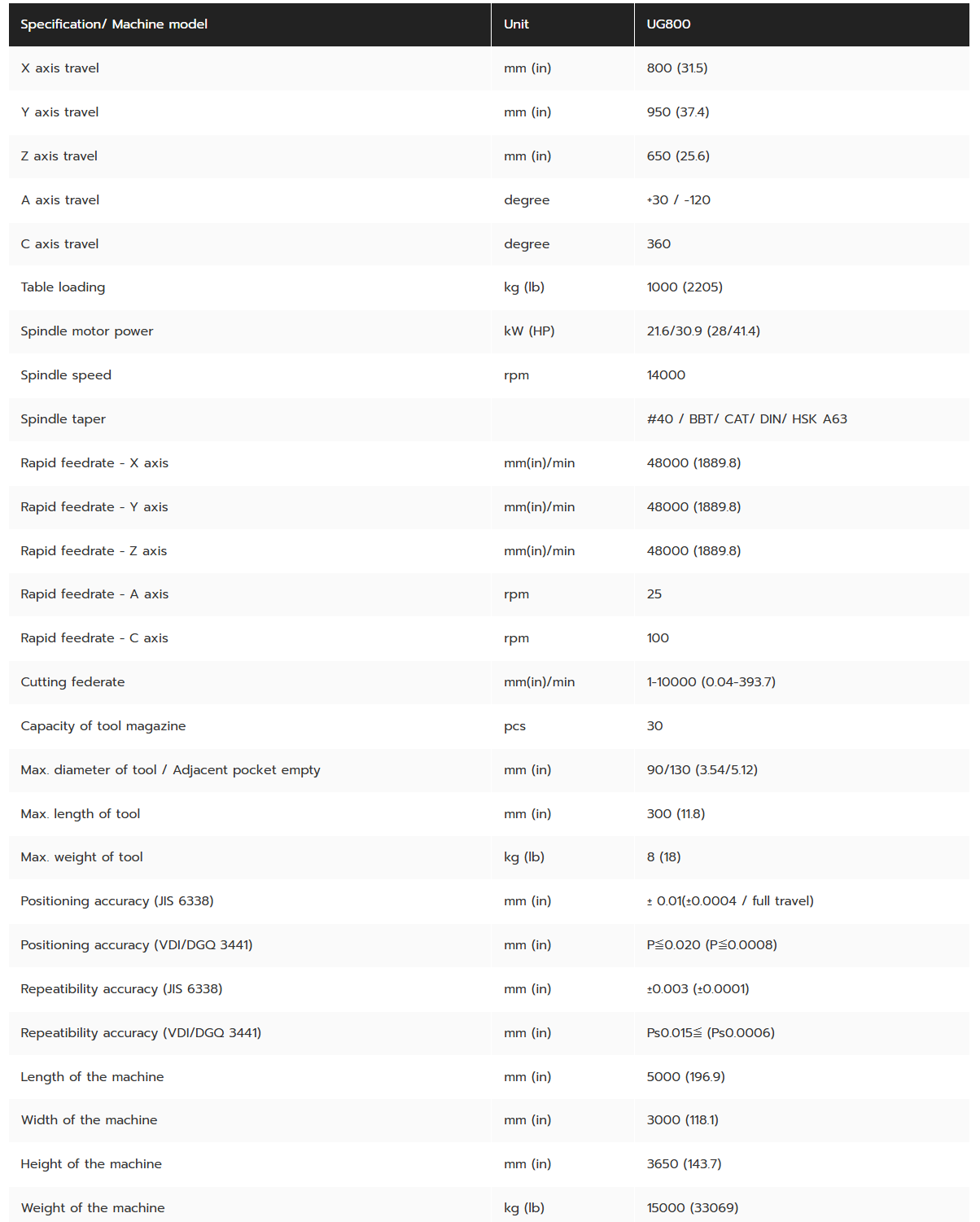 Compact design for 5 sides & 5 axes simultaneous application jobs: Aerospace and general parts machining.
